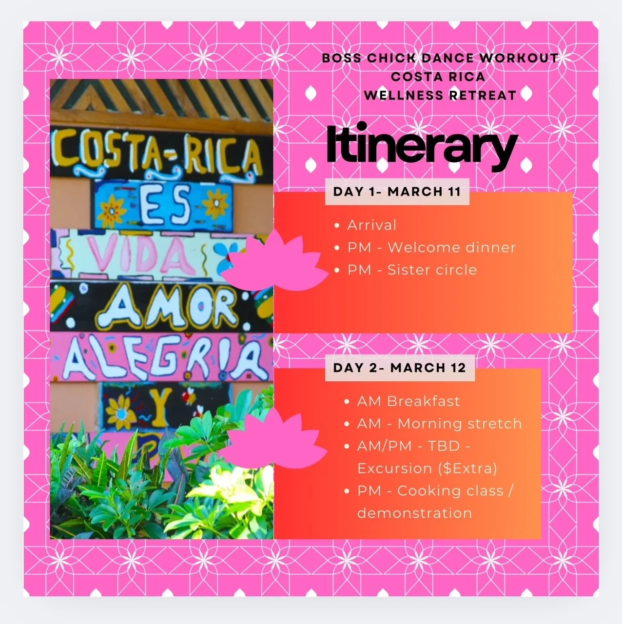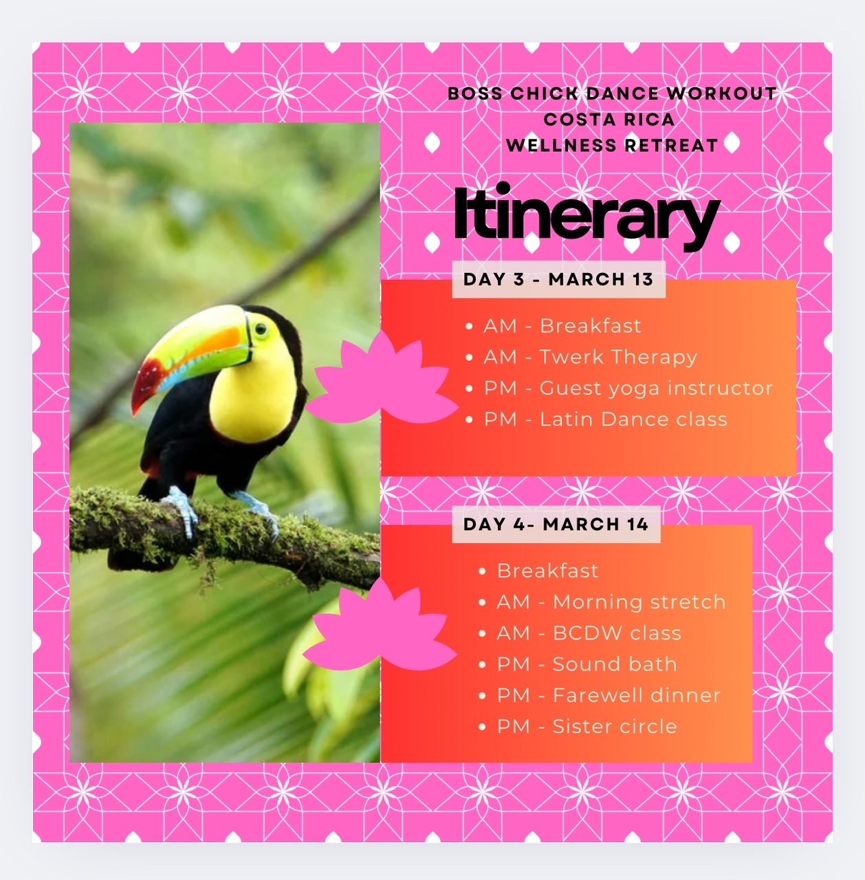 We’re taking the heat, the energy, and the fierce vibes of the Boss Chick Dance Workout to the tropical paradise of Nosara, Costa Rica! This isn’t just a vacation—it’s a wellness retreat experience designed to recharge your body, empower your mind, and elevate your spirit. Surrounded by lush jungle and serene beaches, you'll move, sweat, and thrive with daily dance fitness sessions, mindfulness moments, and sisterhood like no other. Nosara is calling—and your next level is waiting.